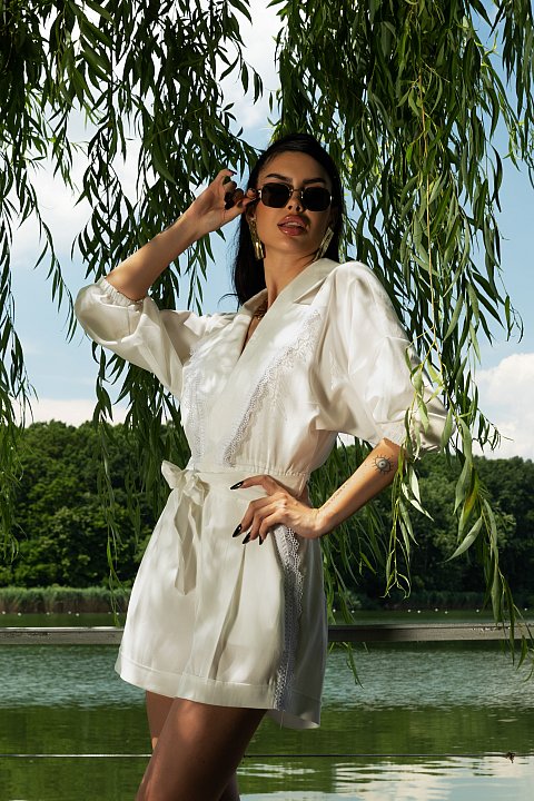 Jumpsuit elegante con pantaloncini e ricami traforati. Maniche 3/4 raccolte, colletto a revers dentellato e fascia annodabile in vita.