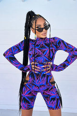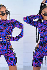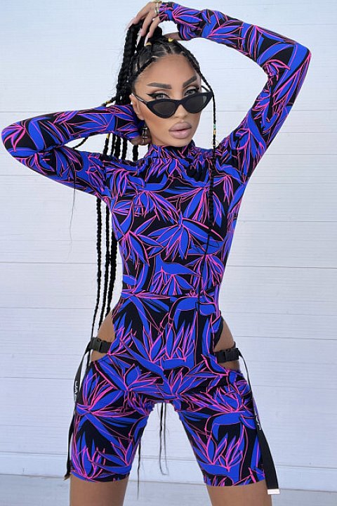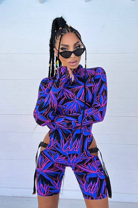 Salopette attillata, in stampa colorata nera, blu e rosa. Modello con taglio in vita, accessoriato con cinturini neri.