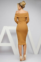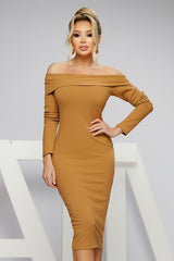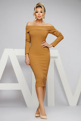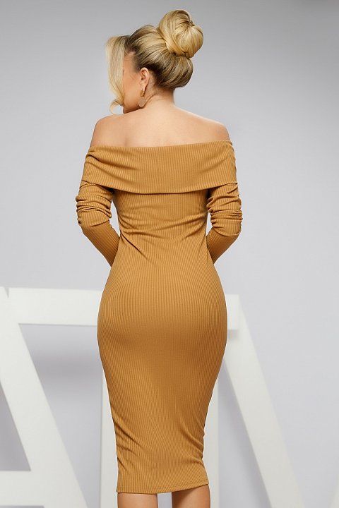 Abito midi marrone chiaro modello tubino a maniche lunghe e scollo alla bardot con risvolto, realizzato in tessuto di maglia leggera lavorata a costine.